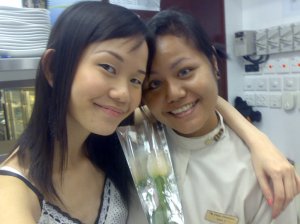 pposed to meet monkey for dinner today.. Went to funan tcc to visit wati & uncle lim.. bought a rose for her and chocolate for uncle lim (as requested by him.).. stayed there until monkey arrived at about 8p.m.. Crap with wati for awhile and kenneth was on shift too. He’s evil. Curse me to fall down. Lame. I was angry with JJ until i couldn’t refrain from scolding wtf to him. kns. don’t like him. but he kept saying he likes me. haha. =X but after he say sorry to me, i am cool. I don’t know why but i feel he’s attituding towards me. humph. talk to him nicely he don’t want. must be fierce then he talk to me nicely. crazy. nvm about him. den we went to this Aria Bistro * Wine Bar at Esplanade for dinner. It’s godamn exp. =X after that we went to kbox. where he asked me that “holy” question.. Sigh. I feel bad though.. but i only treat him as a buddy and nothing else.. =[
