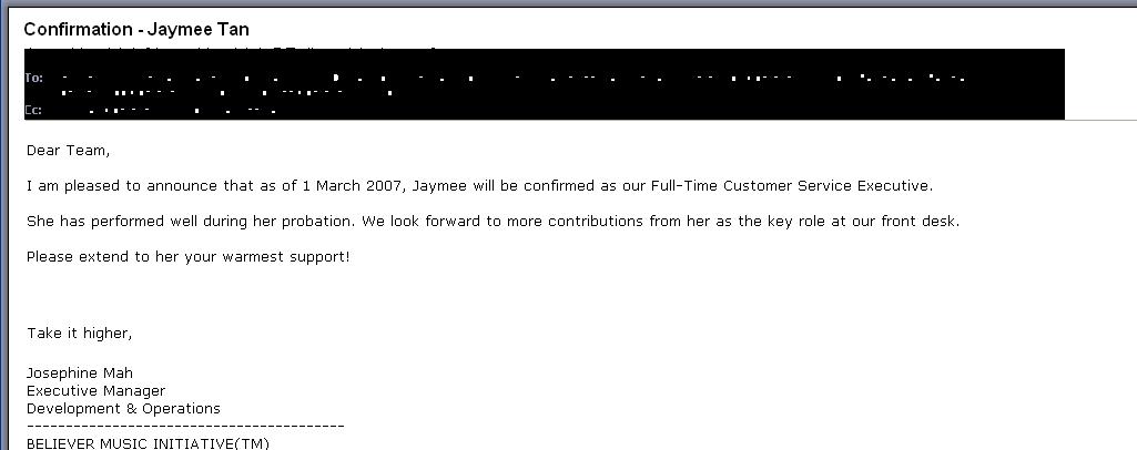 back at work after a week’s break. How nice. hahaha. and today i’m extremely happy because i just got confirmed w.e.f 1st March. =] confirmed = pay raise. and pay raise = i finally can buy my OWN laptop (the laptop that i have dream of for MONTHS)! HAHAHAHA. =] cool. I LOVE it. can u sense my happiness? OMG. =] What’s more can i ask for? Baby says he will acc me to church. =] i got confirmed after 3 months probation. Now i have “career” and “God” and “L.O.V.E“. =] how nice. hahaha. The 1st bf who ever wants to go church with me and NOT ask me to forsake church just because his book out time is precious. That’s imp to me. yeah baby. muahahahhaha. I’m going crazy. Because i’m simply a happy woman now. =D And now, I’m going to learn MORE stuffs! =D have MORE responsibilities = cannot be late. hahaha. Now i will start to learn to reply email enquries. =D i’m thrilled. Gotta brush up on my lang. LOL.