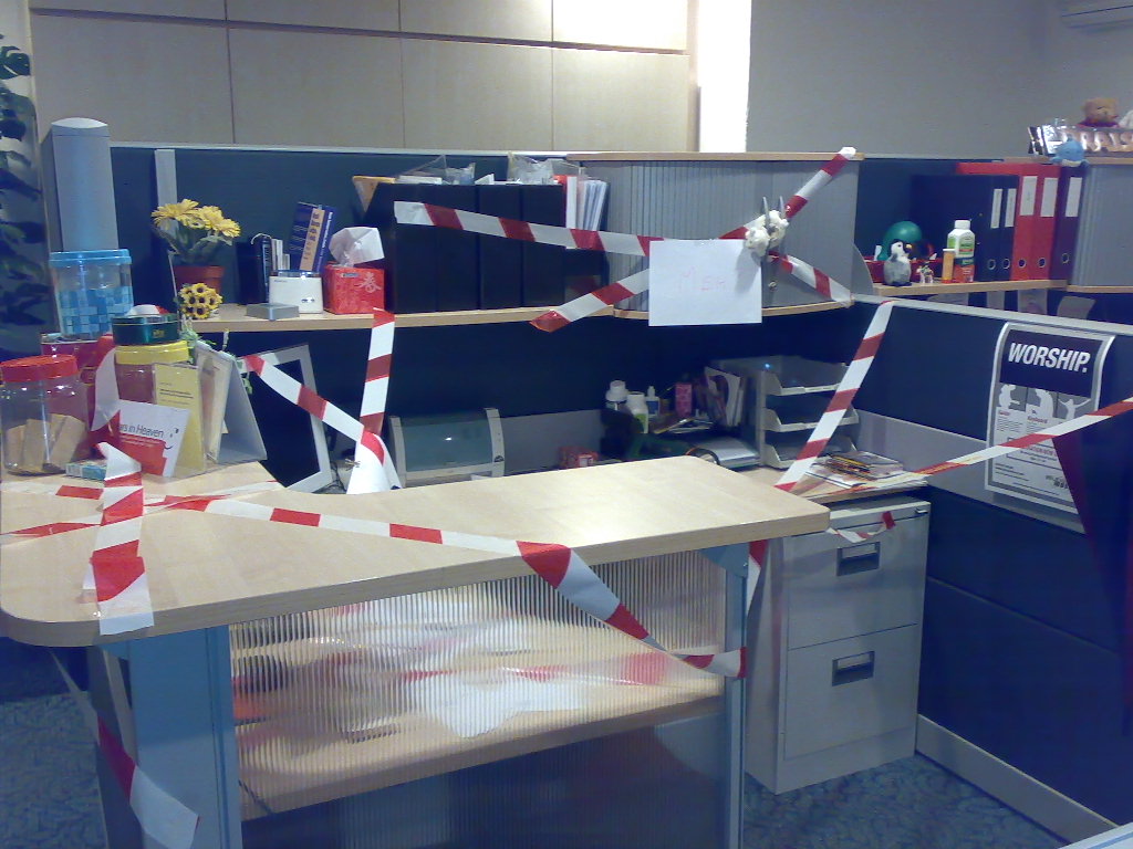 Tomorrow is my manager’s (Josephine) birthday, thus her desk look like this when i came to work today. I was in a shock. hahaha. Terrorist attack at work. and i guess the terrorist is Bernice and Michelle? When i left the place yesterday her desk was still neat. We had a birthday party for Josephine and farewell party for Shaun as well because he’s leaving for Texas soon. So i drew him an america flag and singapore flag. Hahaha. Had fun today. =] PLus baby POP today.. He came down to fetch me from work.. so we only meet each other for less than an hr… kinda bo liao… But i’m happy just to see him. =] because it’s not every week we get to meet everyday. He’ll need to stay in camp for another 3 months. =] Meet up with my sister for lunner (lunch + dinner).. Haha. We can only meet when her boss is out of town. But her boss will be reaching singapore tomorrow morning, thus no more dinner together anymore. =[ but nvm, not like we are not going to have dinner anymore. muahahaha. =] time to zz! i’m tired.