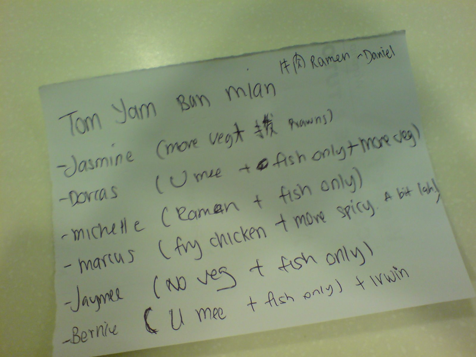 This is the list for the Tom Yam Ban Mian/ Ramen today. =] SEVEN of them. Omg. even irwin had the same food. Only Daniel had Beef Ramen. =P It’s boss’s treat today.