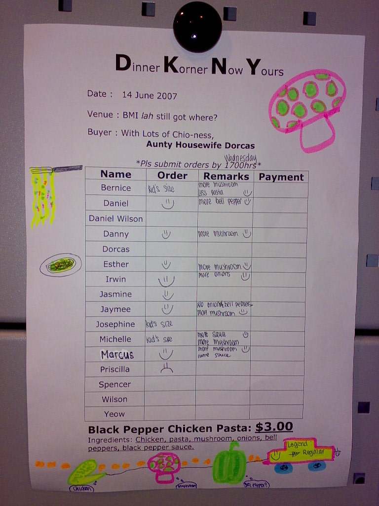 This is the DKNY list for this thursday. Black Pepper Chicken Pasta. LOL. pictures are drawn by me and Bernice. =P