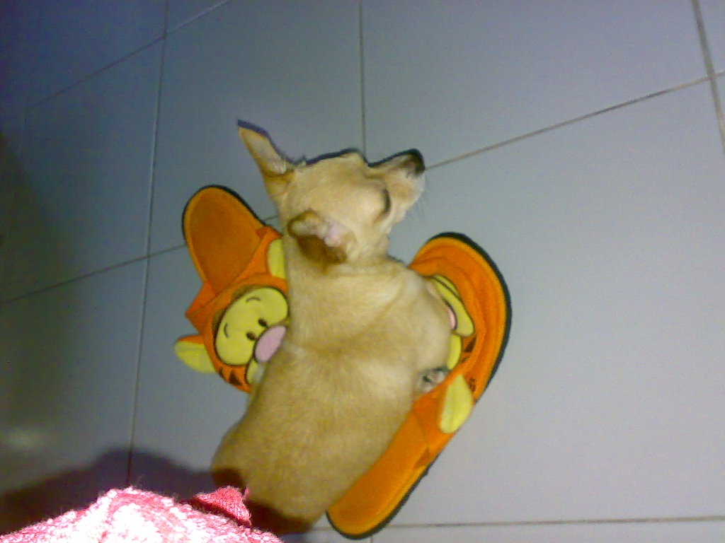 when i woke up in the morning, i saw my dog resting on my tigger slipper and guurrr at my grandma. =.= what a stupid dog.