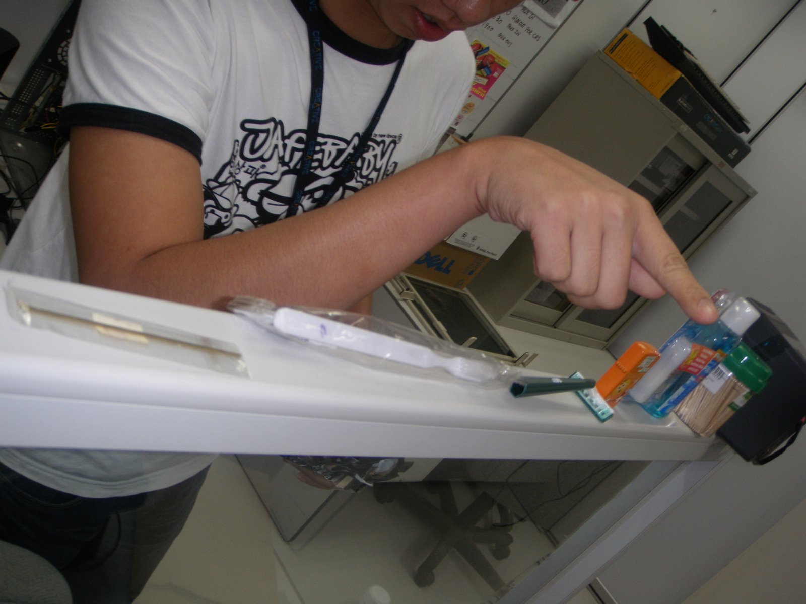 His birthday present: (from left to right) the stick that used to dig ur ears, disposable toothbrush and toothpaste, shaver, a damn cute zippo, listerine and toothpicks. And he should be well prepared for his LONG LONG leave.