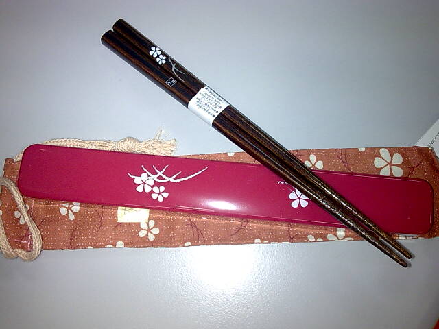 Brandon is back from Japan! And he got me a pair of chopsticks. If you think it’s weird, I don’t think so, because I requested it. It’s so pretty and cute. =D