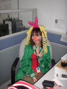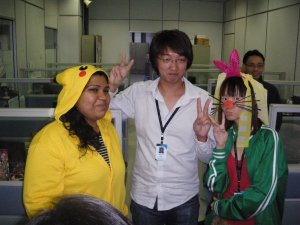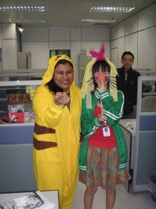 It’s a tradition that people get sabo for their birthdays, it doesn’t matter whether it’s belated or not because sabotage is a MUST. Soooo, their sabotage starts at 5.15p.m because that’s the time I finish work and Zong Da was so serious until I thought they are going to sack me. Anyways, they really dress Winna up as Pikachu (don’t ask me why, because when I first joined the company, this is already her nickname) and dress me as Minnie Mouse loh. =.=