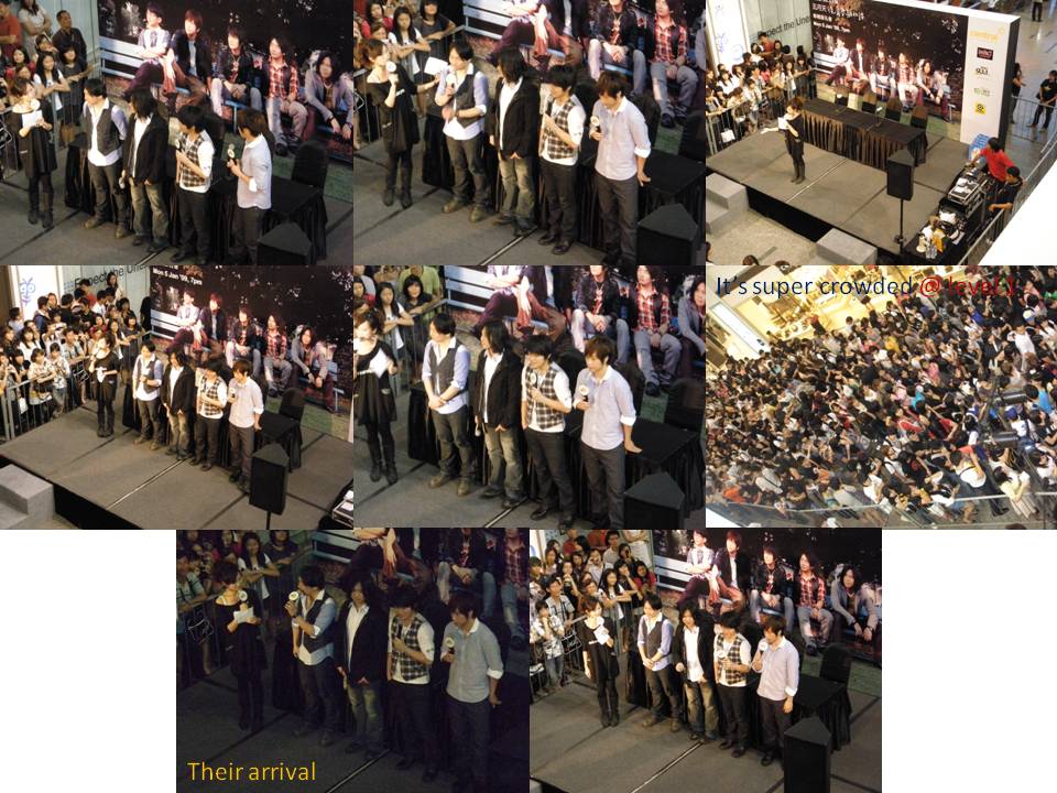 First, it’s crowded with LOTS of inconsiderate people (from whatever country behaving as if they get to kiss/hold/touch the stars if they can stand nearer to the stage). Example: I didn’t realized there was a couple of CHINA people standing beside me and so naturally I went in front to get a better view since I’m short. But this 2 CHINA girls came and push me and STARED at me & Feng Mei as if we took their place. C’mon lah, if I accidentally stand at their place, what they can do is, they can be more civilized and tell me instead of pushing me which I particularly don’t like. I was thinking, if they wanna have a better view of the stars, why don’t they just go buy the album and join in the queue? In this way, they can LOOK AT them face to face and better still, get to shake hands with them!